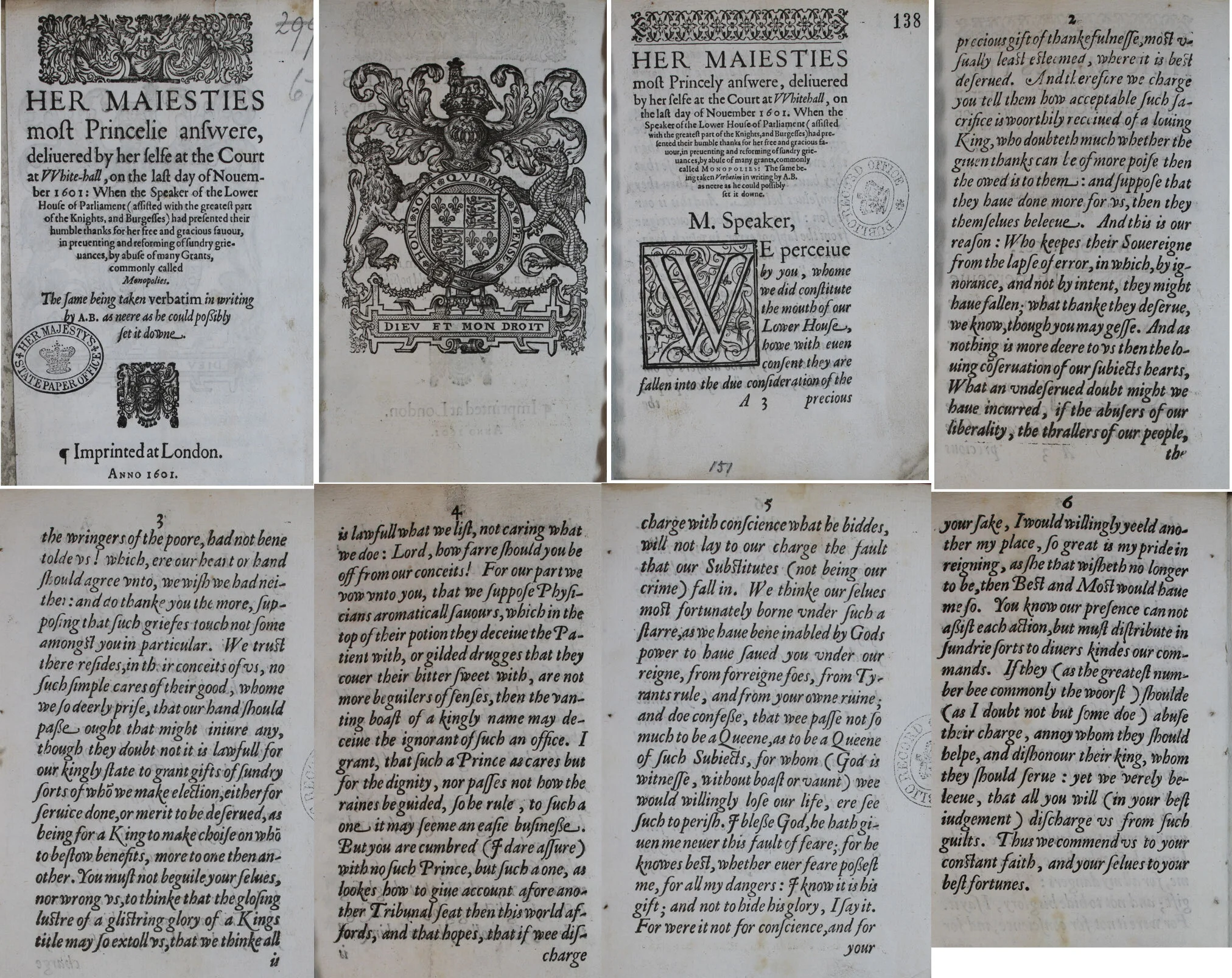 Her Majesty’s most princely answer, delivered by herself at the Court of Whitehall, on the last day of November 1601: When the Speaker of the Lower House of Parliament (assisted with the greatest part of the Knights and Burgesses) had presented their humble thanks for her free and gracious favor in preventing and reforming of sundry grievances, by abuse of many Grants, commonly called Monopolies. The same being taken verbatim in writing by A.B. as near as could possible set it down. Imprinted at London. Anno 1601. (title page)